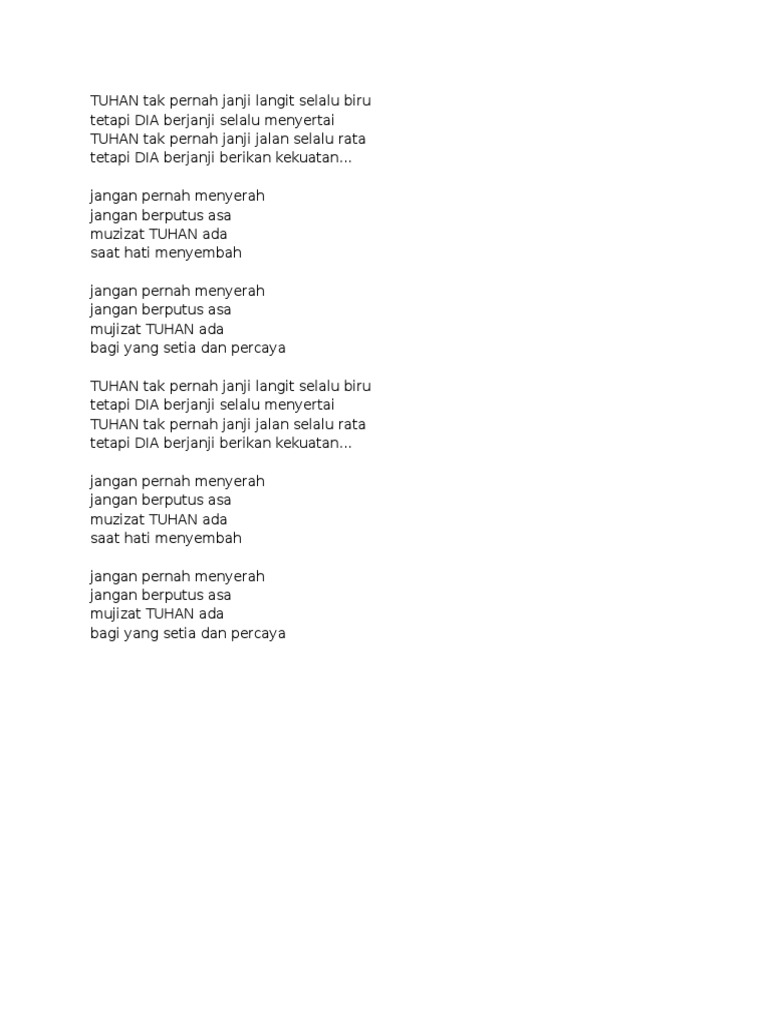 Tak pernah tuhan janji hidupku takkan pernah berduri tak pernah dia berjanji lautan tenang Tuhan tak pernah janji langit selalu biru. Download lagu, lirik lagu, dan video klip terbaru. Tuhan tak pernah janji, jalan selalu rata tetapi dia berjanji, berikan kekuatan. Ku percaya kau tuhan yang tak pernah lalai.